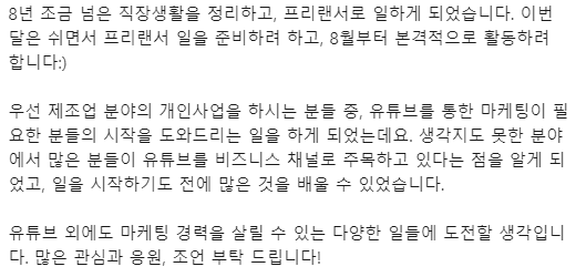 내가 일을 하는 데 가장 크게 동의를 얻어야 하는 사람들에게 모두 OK 사인을 받았으니, 링크드인에도 프리랜서를 하겠다고 글을 올렸다. 링크드인에 글을 올린다고 당장에 어떤 일이 들어오지는 않겠지만, 카톡으로, 메시지로 많은 분들의 격려를 받을 수 있었고 잘 해봐야겠다는 다짐을 다시 한 번 할 수 있게 되었다.